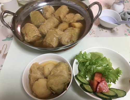 隙間に茹でたキャベツの残りを1/4ずつ切って詰めたけれど