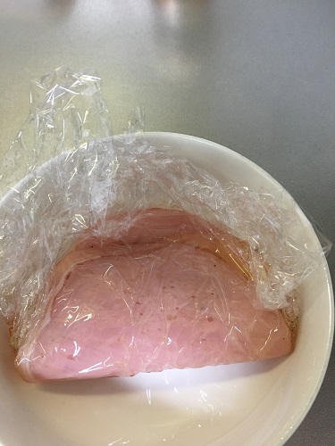 ラップごとハムでつつむように形を整えて電子レンジでチンすると……