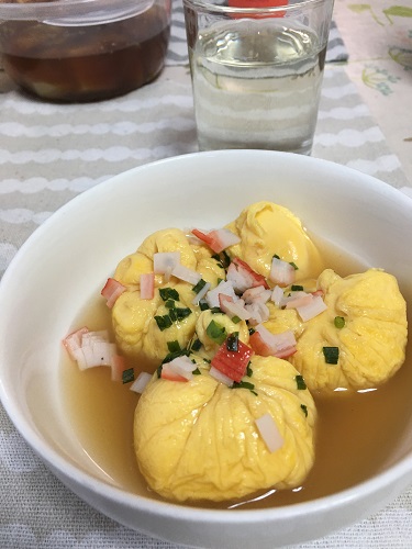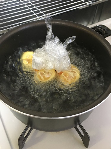 氷水の中に入れて余熱を取ったらラップを外してお皿に入れる。