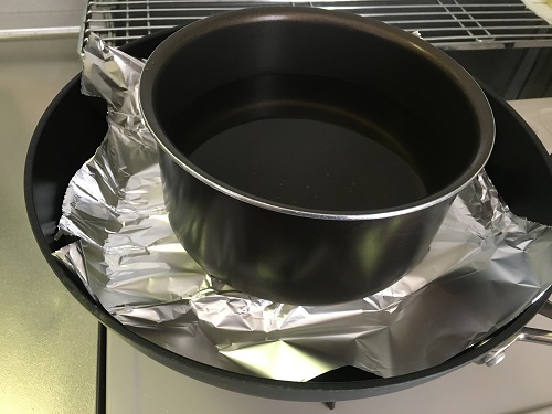 その上にアルミホイルを敷いて水を入れた鍋を重石として乗せる。
