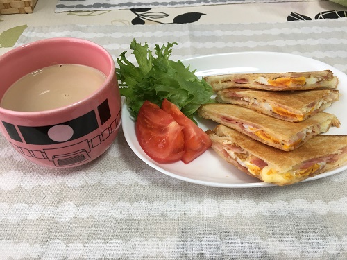 ベーコンエッグを乗せてチーズを乗せてパンを乗せる。