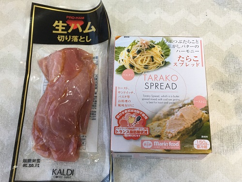 生ハム、たらこスプレッド(大さじ1)を入れてさっと炒め