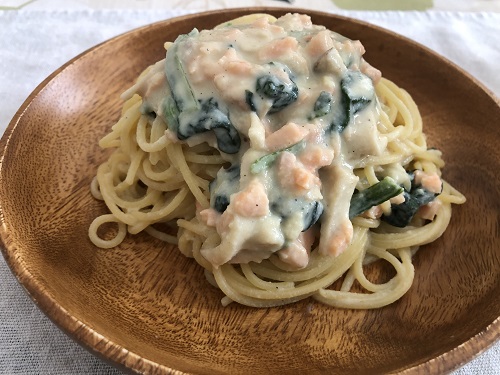 冷凍野菜のホウレンソウ、エリンギ、スモークサーモンを投入!