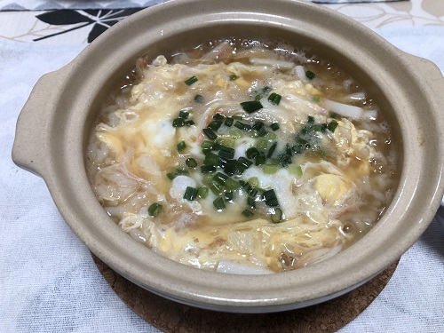 という事で1日の日の夕飯はこれを使ってカニ玉雑炊にしてみた。