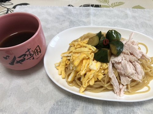 トッピングはレモン風味のサラダチキン、キュウリのピリ辛漬け、卵焼き。