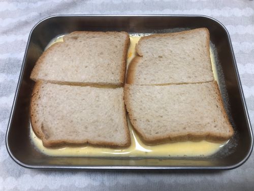 3.バットに卵液を入れてから適当な大きさに切った低糖質ブラン食パンを浸す。