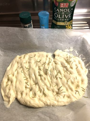 4.オリーブオイルを全体にかけ、指で穴を開け、岩塩とドライローズマリーをかける