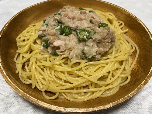パスタの上に先ほどの大根おろし+シーチキン+オクラを乗せる。
