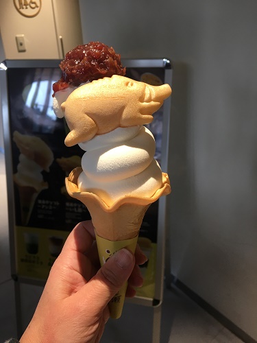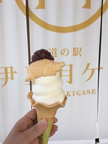 出来上がった「猪最中ソフト(小豆のせ)」はずっしりと重い。