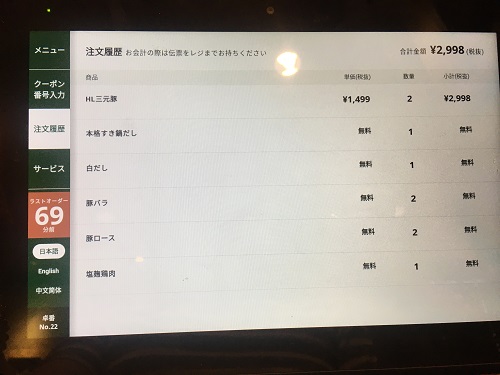 オーダーはタブレットタイプになっていてSちゃんも少し驚いていたが