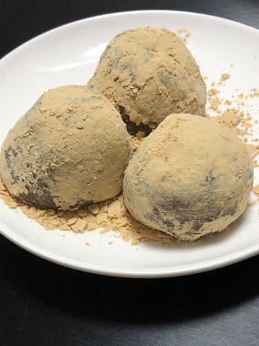 遠州名物のモロコシ入り大福にきなこをまぶしてある。