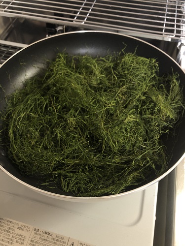 半分に切ってからフライパンに入れて炙る。