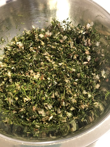鮮やかな緑色になったらボウルに移して粉々にもみほぐして