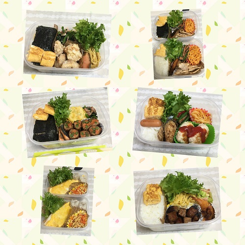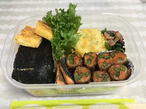 肉巻き弁当(グラタン、塩鮭、インゲンとベーコンのソテー、レタス、玉子焼き)