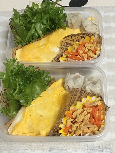 オムライス弁当(レタス、シュウマイ、ニンジンのしりしり)