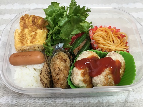 チーズ入りハンバーグ弁当(玉子焼き、ウィンナー、メンチカツ、パスタ、
