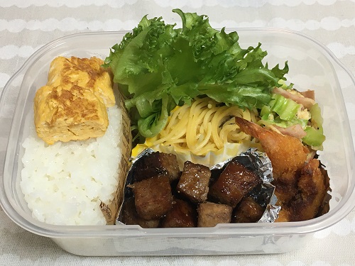 サイコロステーキ弁当(レタス、玉子焼き、パスタ、エビフライ、
