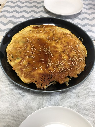 チーズを先にフライパンに敷き詰めてから生地を乗せて焼いていた。
