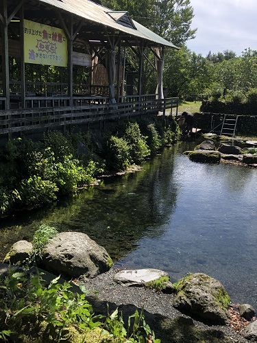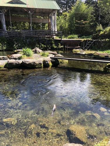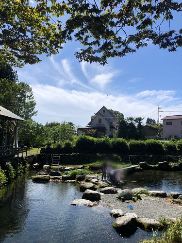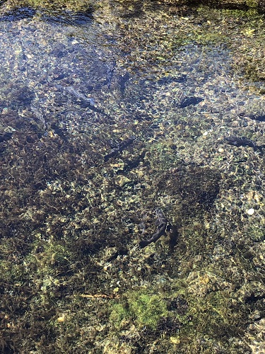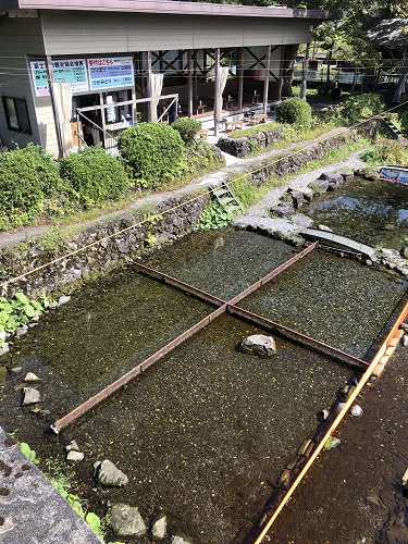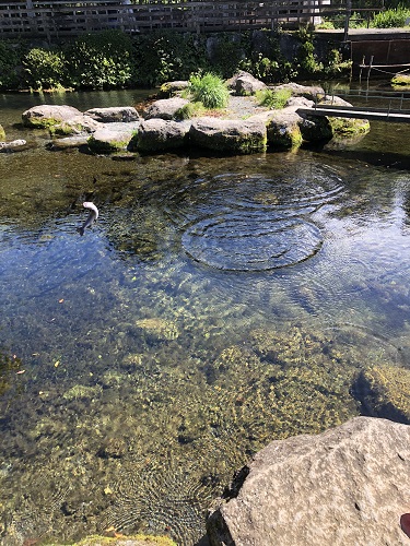 駐車場からニジマスが泳いでいる池を見てみると透明度がとても高い。