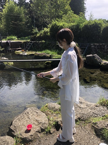 餌をポチャンと池に投下すると魚がすぐに寄ってきてあっという間に餌だけ取ってしまう。