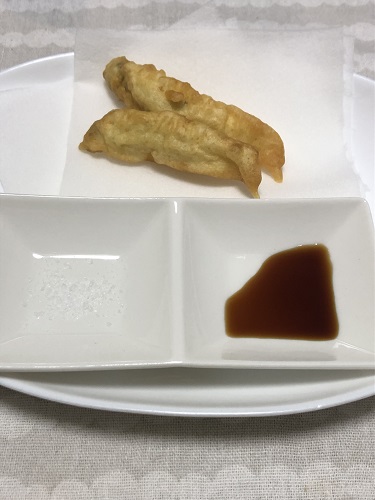 天ぷら粉を付けすぎて見た目はエダマメみたいになってしまった。
