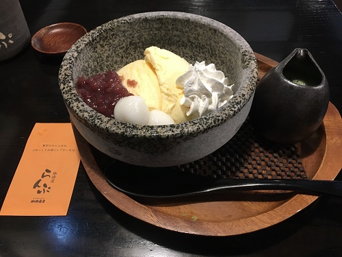 冷えたストーンにバニラアイス、小豆、白玉、生クリームがあり