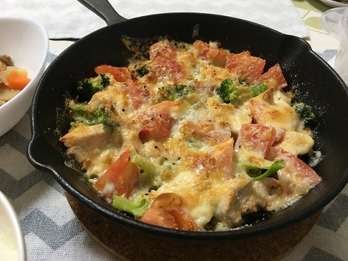 「鶏むね肉とブロッコリーとトマトのチーズ焼き」の上に