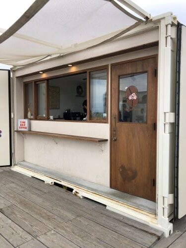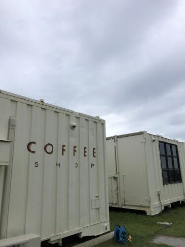 ガーデンパークの駐車場の横にあるコンテナ風建物のカフェ