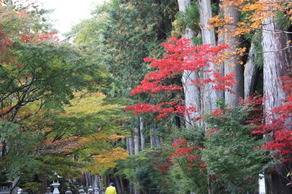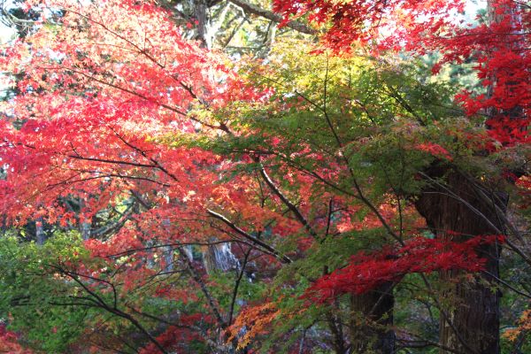 確かに緑色の木も目立つが、赤く色づいている木もあり