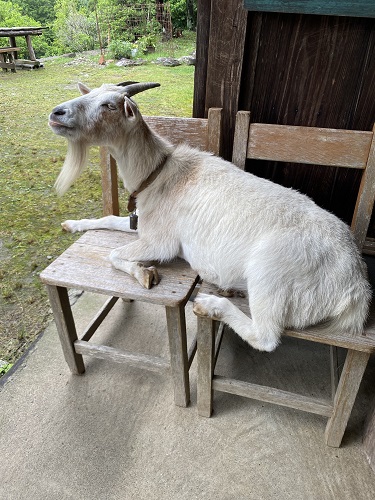 何と!入口付近の椅子にヤギが一頭座っている。