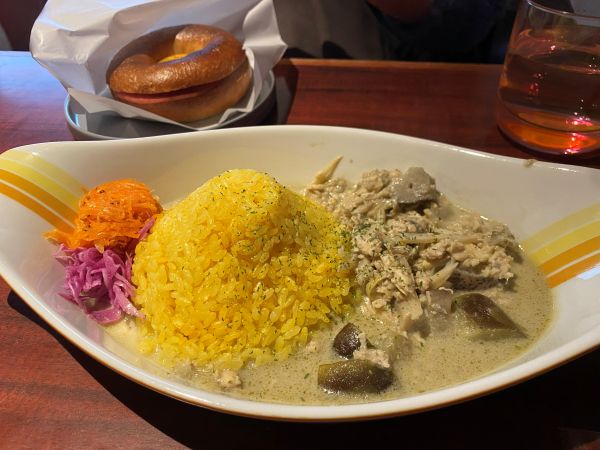 グリーンキーマカレーは鶏ひき肉、タケノコ、ナス、シメジ入り。