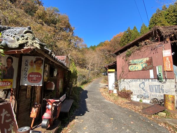 急な坂道を下り、カフェの手前にある駐車場に停める。