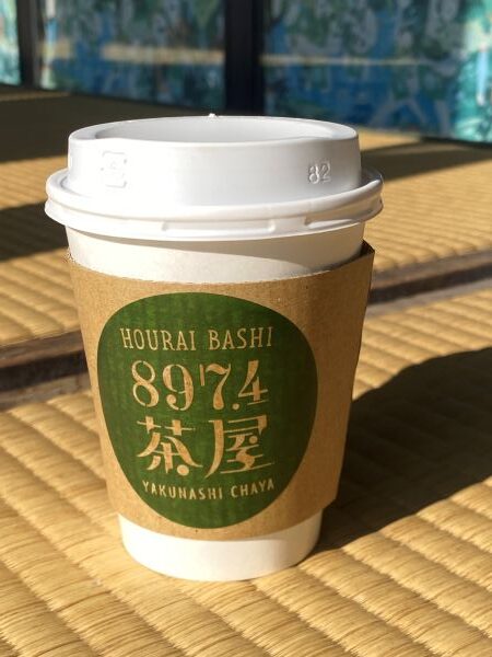 畳縁台に座って蓬莱橋を行き交う人たちを眺めながら