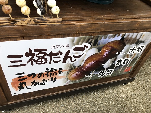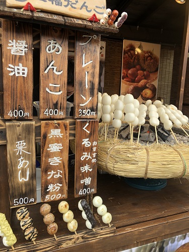 更に別のおだんご屋さんで「三福だんご(黒蜜きなこ)」を買って食べているSちゃん。