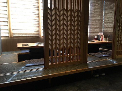 タレ、塩、すりおろしワサビを付けて焼いたお肉を食べる。