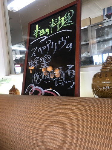 本日の料理」に「スペアリヴのハチミツ紹興酒煮」と書いてある。