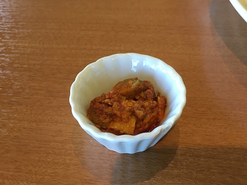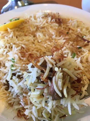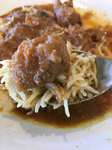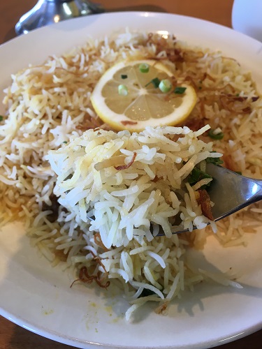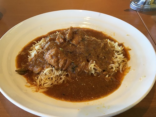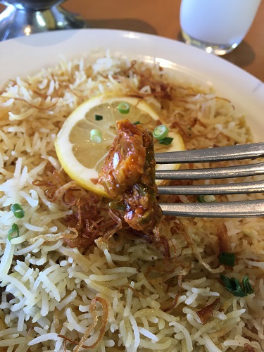 ビリヤニを半分食べてからカレーをかけて食べる。