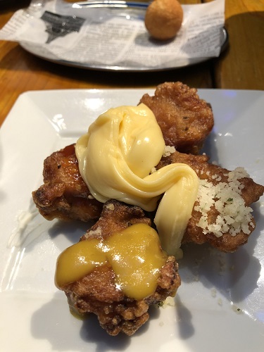 熱々の鉄板でチーズを溶かしチキンに絡めて食べる。