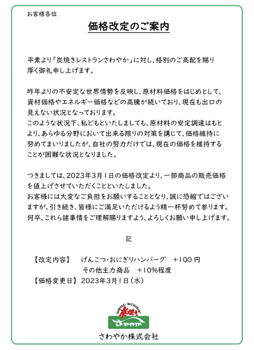 げんこつハンバーグ、おにぎりハンバーグは100円の値上げ。