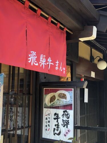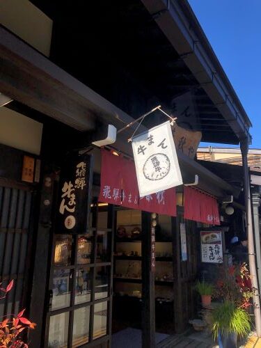 古い町並みにはいくつかの飛騨牛にぎり寿司のお店、飛騨牛まんのお店がある。