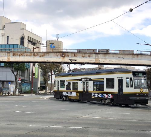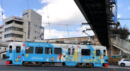 歩道橋の下で交差点を曲がる豊橋信用金庫のラッピング車両と