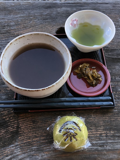 茶文字山まんじゅうと緑茶ようかんを買い、おしるこを頼んだ。