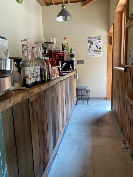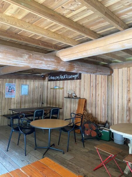 屋根付きのオープンテラスでカウンター席が窓際にある。