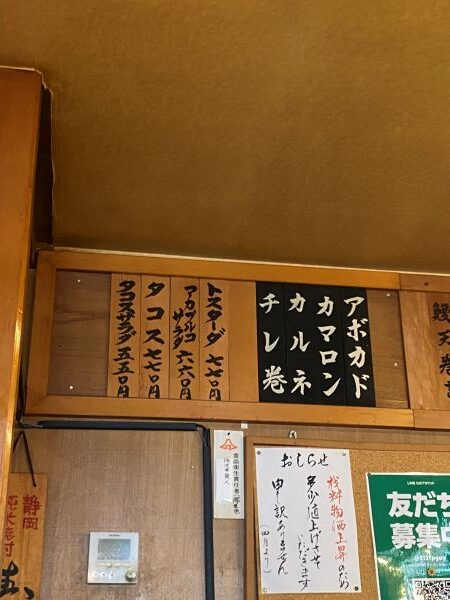 メニュー表を見ると、お寿司、お刺身、サラダ、揚げ物、丼もの、一品料理、