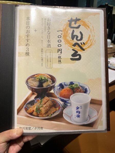 1000円(税抜き)で3種類のおつまみと好きな日本酒が選べるらしい。