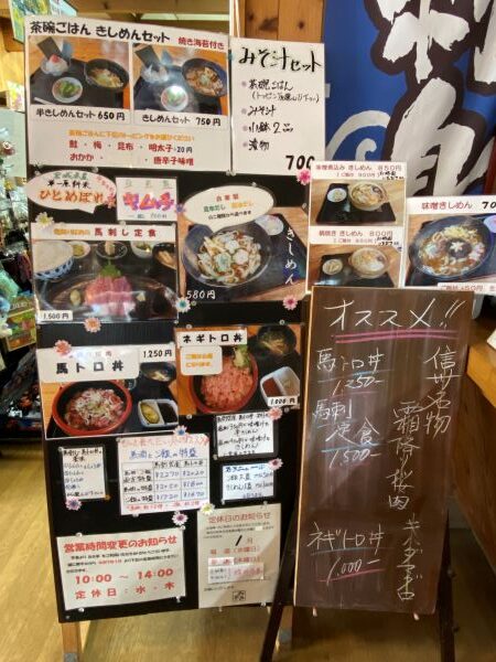 「信州名物霜降り桜肉 馬トロ丼、馬刺し定食」