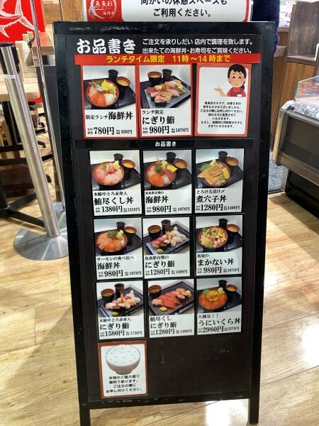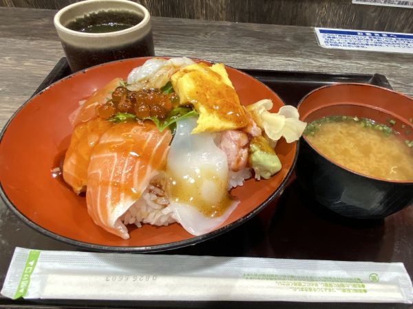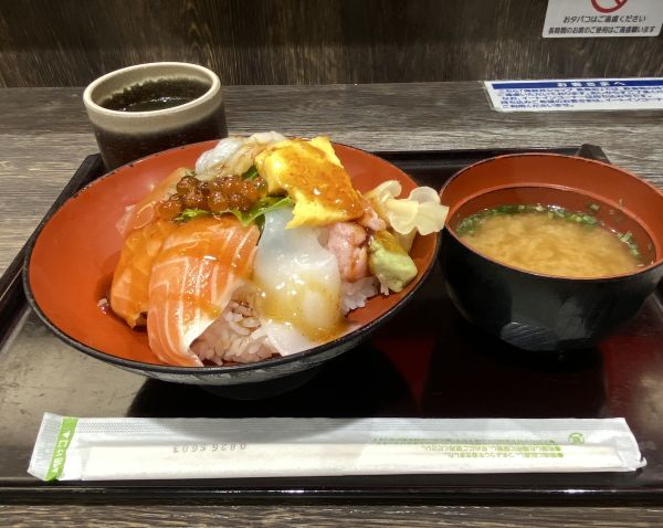 カウンター席に荷物を置いて確保、ランチタイム限定の「海鮮丼」をレジでオーダー。