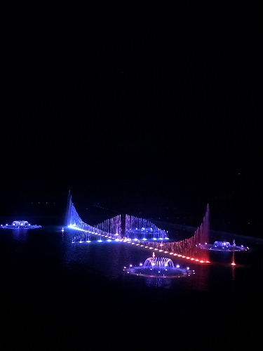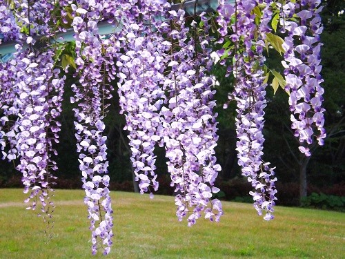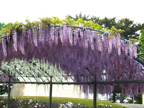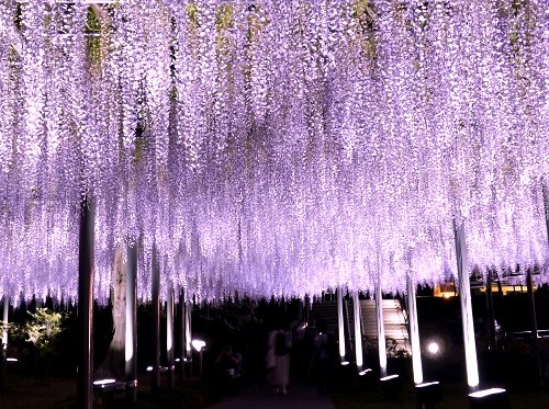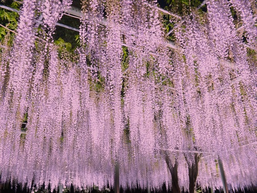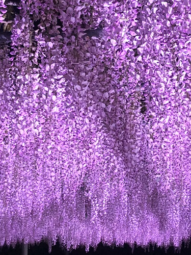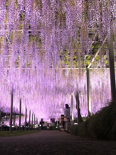 日が暮れて薄暗くなってきてライトアップしている藤棚も紫色のカーテンみたいで