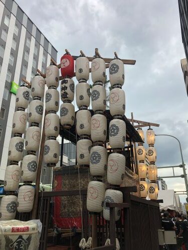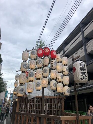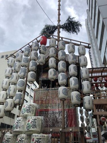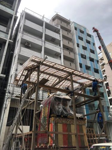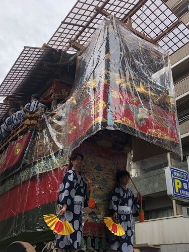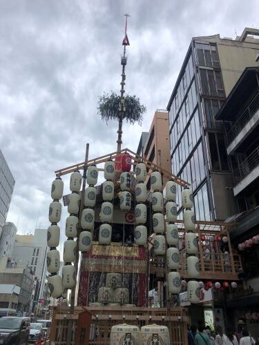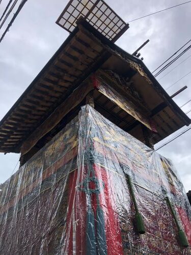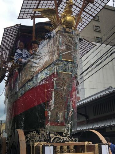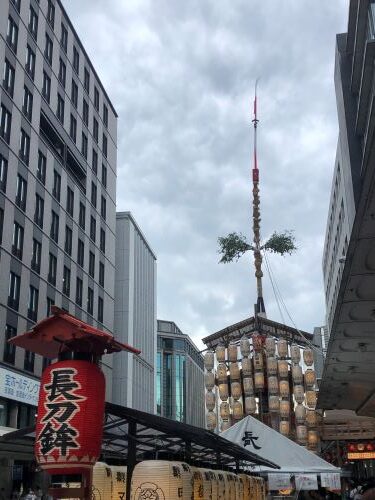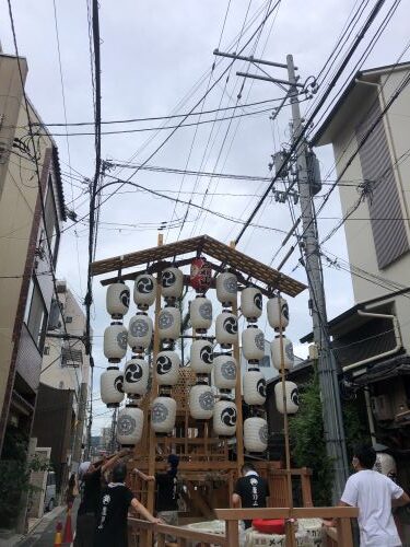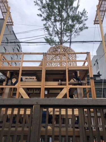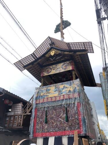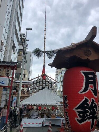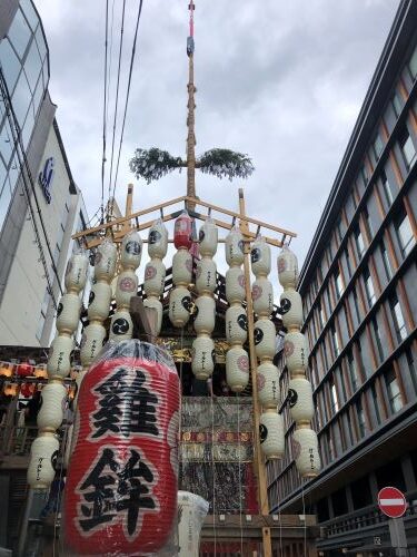 鶏鉾が巡行開始後に車輪の破損で四条通で立ち往生してしまったらしい。