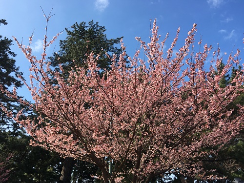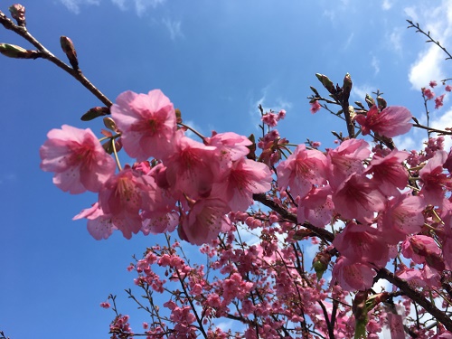 寒緋桜系で河津桜よりも開花が早く日本一早いという。